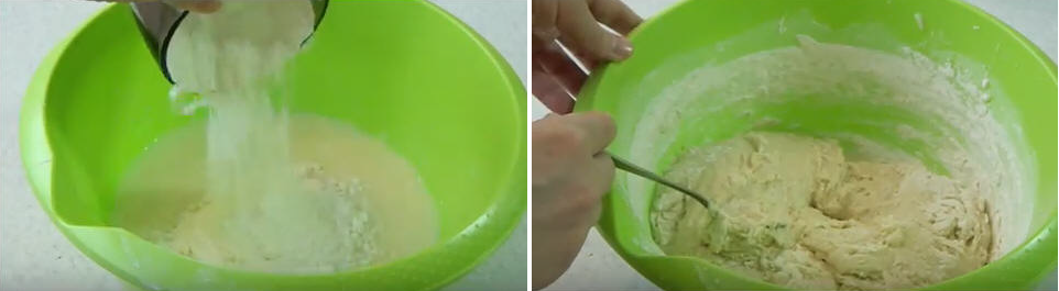 - Добавьте в тесто муку. Делать это нужно понемногу, маленькими порциями, каждый раз хорошо размешивая, чтобы не было комочков.
