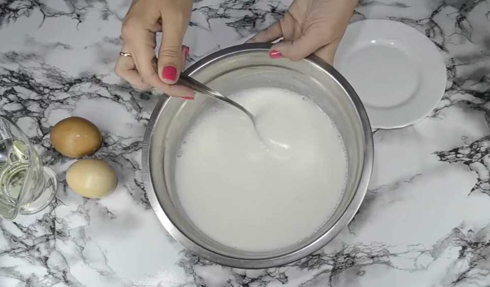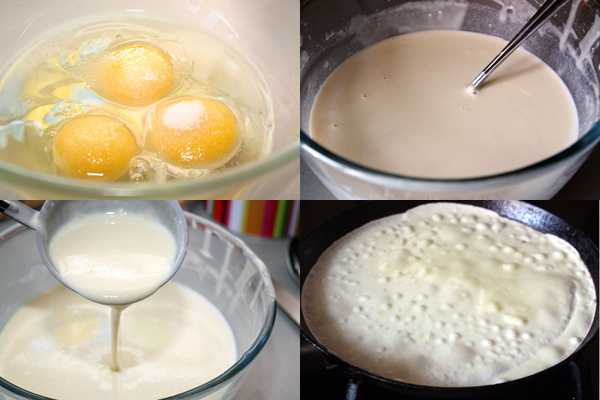 Молоко подогрейте совсем немного и влейте в блинное тесто.