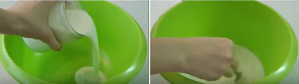 Готовить начинаем с того, что выливаем кефир в подходящую миску или кастрюлю, а затем слегка взбиваем венчиком. Это необходимо для того, чтобы появились пузырьки.