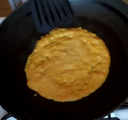 Вылить порцию теста на поверхность сковороды и подождать 2 минуты, затем перевернуть и продержать еще 45 секунд на другой стороне.