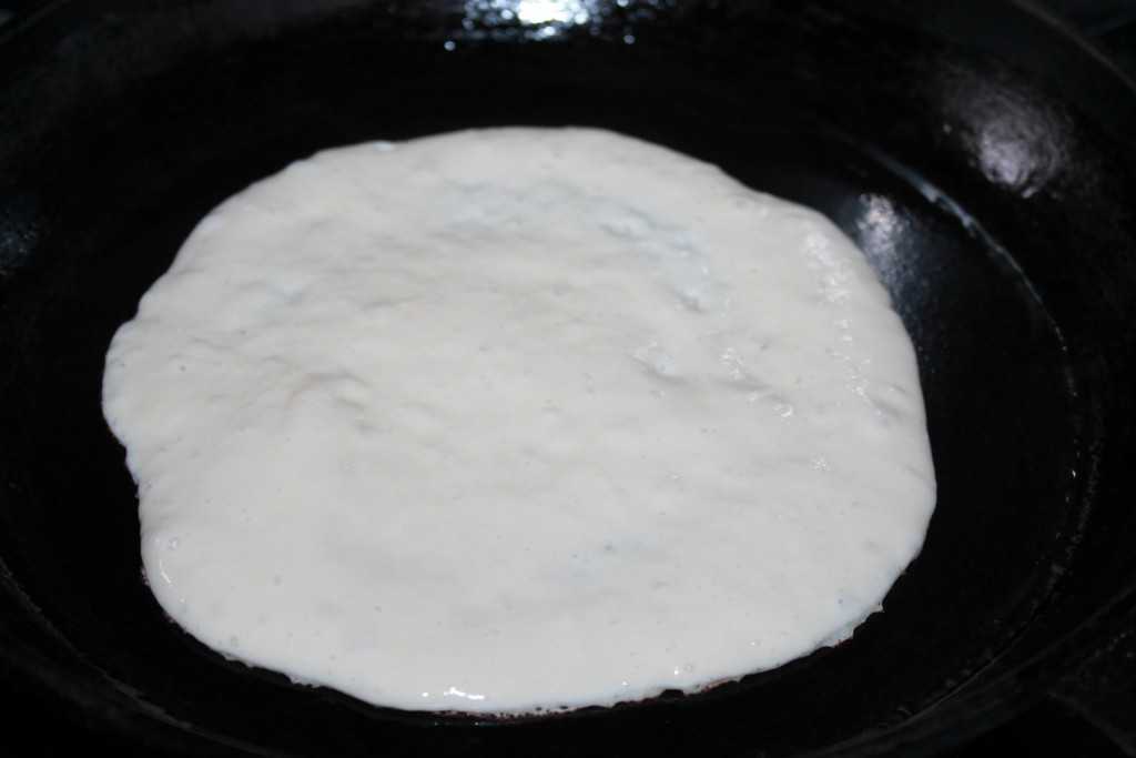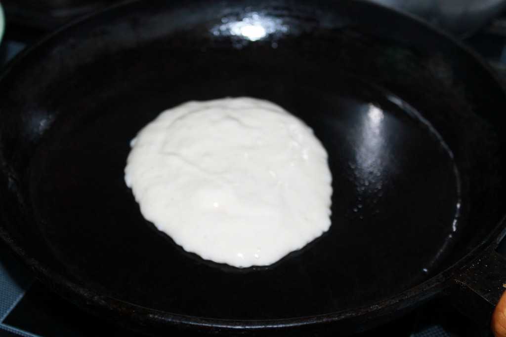 Разогреваем сковороду и добавляем в нее буквально капельку растительного масла. Когда сковорода раскалится, ставим огонь чуть меньше среднего и выливаем порцию теста, чтобы оно растеклось слоем в 3-5 миллиметров.