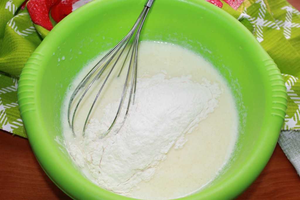 3. Муку просеять и добавить в смесь. Тщательно перемешать до исчезновения комочков. Можно воспользоваться для этого венчиком.