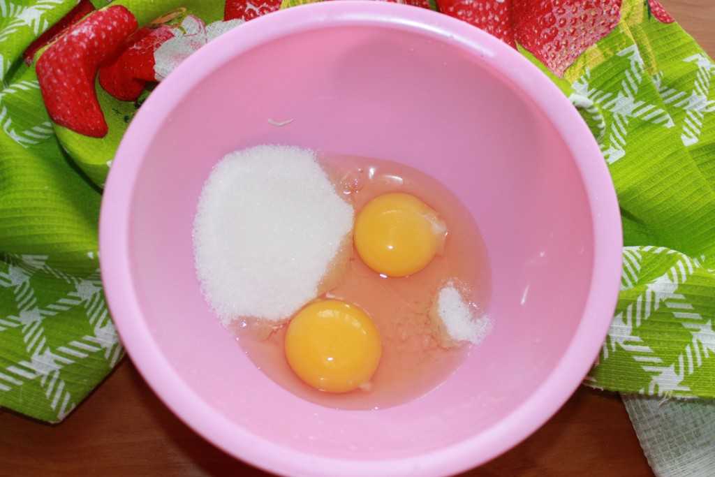 В глубокую чашу разбейте яйца, всыпьте сахар и соль, взбейте при помощи вилки, венчика или блендера.
