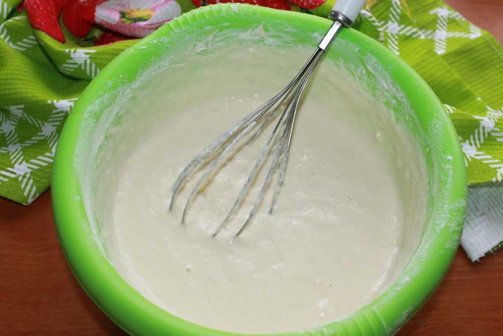 Отмерить нужное количество муки, просеять ее. По столовой ложке добавлять в миску и сразу замешивать тесто. Так масса будет однородной, без комков.
