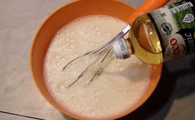 Далее в полученную массу налейте растительного масла и взбейте венчиком.