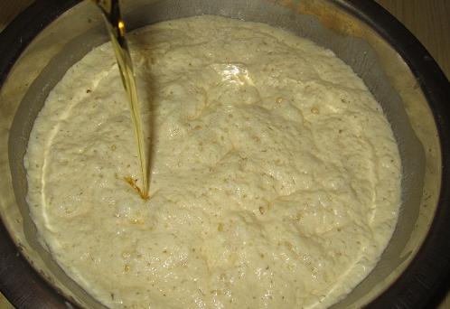 - В конце наливаем 1 ст.л. растительного масла.В последний раз размешиваем и ставим в тепло примерно на 30-40 минут.