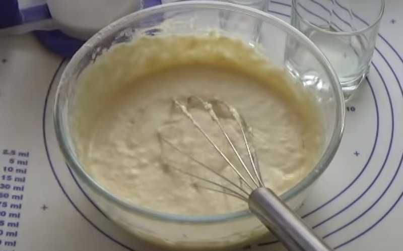 - Порциями добавляем муку. Так как по этому рецепту блинчики получаются толстыми, то тесто для них должно быть немного гуще и по консистенции представлять собой нечто среднее между блинным и оладьевым.