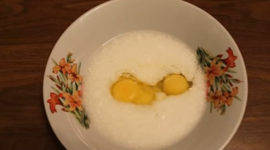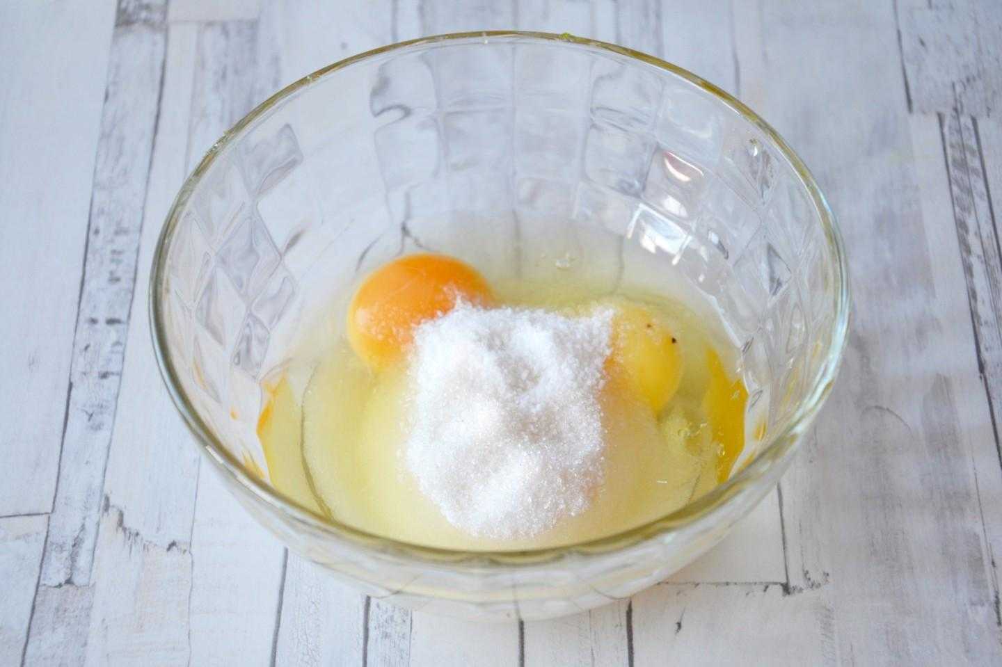 В емкость разобьем два куриных яйца, добавим сахар, соль и перемешаем, чтобы желтки и белки соединились между собой.