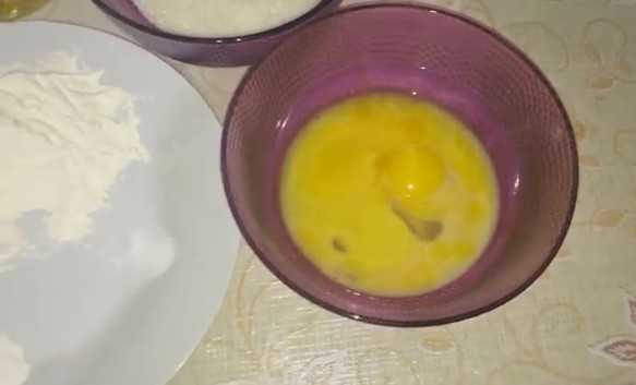 Кефир подогреваем на плите. К теплому кефиру вбиваем два яйца, сразу быстро взбиваем венчиком.