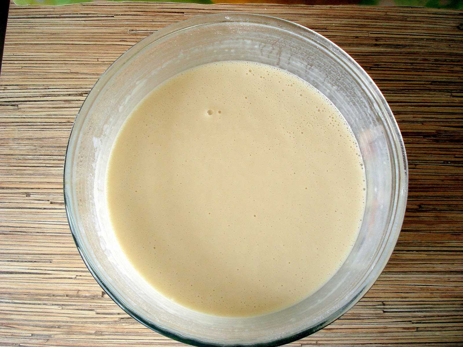 - Когда дрожжи запенятся, вливаем к яичной смеси. Перемешиваем и выливаем весь оставшийся кефир.