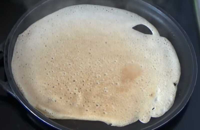 Наливаем немного теста по центу и выравниваем его по всей поверхности. Моментально появляются дырочки. Слегка подрумянили первую сторону, переворачиваем на другую.