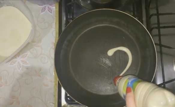 3. Перелейте смесь в бутылку и закройте ее крышкой, на крышке сделайте отверстие или же возьмите лучше бутылку от детского питания, подойдет бутылка, в которой в магазине продают питьевую воду, например Агуша или Фрутоняня, там уже есть такое специальное отверстие. Разогрейте сковороду и смажьте ее растительным маслом.