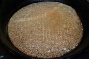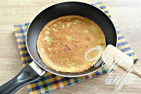 Массу требуется отставить на 5 минут, а затем влить в нее масло. Промасленная сковородка прогревается на быстром огне. На середину жарящей поверхности выливается немного подготовленного теста, которое немедля распределяется по всей сковороде. Во время обжаривания все пузыри должны лопнуть, а блины приобрести румяный вид. В основном на выпекание 1 блина с первой стороны затрачивается 60 секунд, а со второй – 30.