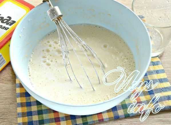 - Разбейте в миску с кефиром яйца, засыпьте сахар, соль, пищевую соду. Хорошенько размешайте массу.