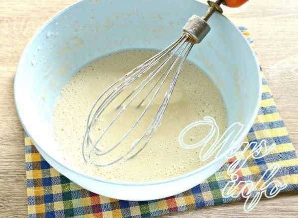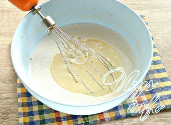 - Небольшими порциями добавьте муку. не кладите сразу много, иначе трудно будет разбивать комки. В итоге у вас должна получиться густая смесь.