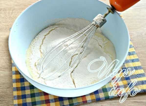 - В посуду всыпают муку, которую тщательно перемешивают с остальными ингредиентами.