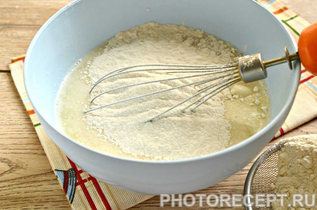- Продолжая взбивать, всыпать в миску 10 столовых ложек муки.
