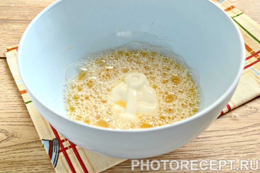 - Добавьте майонез и взбейте компоненты венчиком.