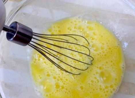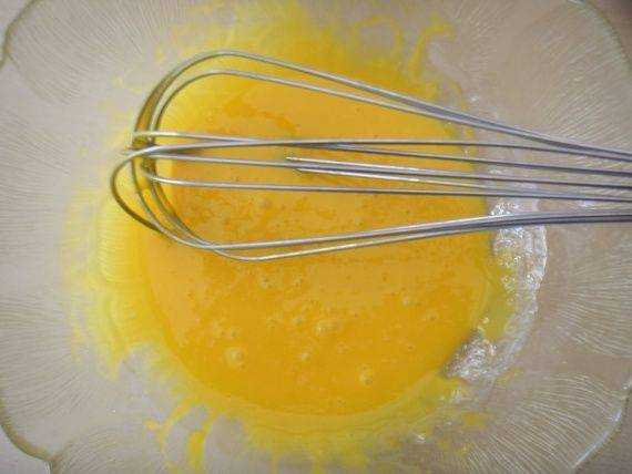 В глубокую миску разбейте куриные яйца, высыпьте к ним сахарный песок и соль. С помощью венчика перемешайте все до однородного состояния. Взбалтывать и превращать в пену яйца не нужно.