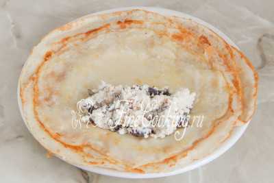 - Ложку начинки выложить на блин ближе к краю, и завернуть в виде конверта, укладывая фаршированные блинчики на тарелку швом вниз.