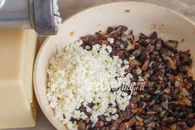 В уже немного остывшую начинку добавляем натертый на крупной терке сыр, перемешиваем