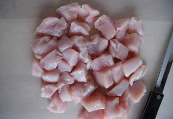 - Мелко нарезать кубиками 350 г куриной грудки (филе).