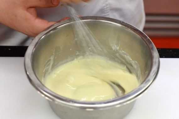 - В глубокую емкость разбиваем яйца, солим, подслащиваем их и хорошенько вспениваем миксером. Добавляем муку, разбавляем молоком и еще раз взбиваем.