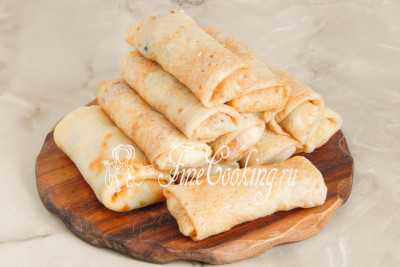 - Раскладываем наполнитель по блинчикам, заворачиваем их так, чтобы полностью скрыть содержимое.
