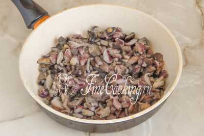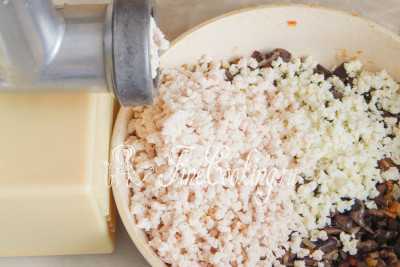 - Чтобы получить начинку, мясо варим, а грибы и лук (порезав кубиками) прожариваем в масле. Курятину режем, соединяем с остальными продуктами, перчим, присаливаем, добавляем потертый сыр (половину).