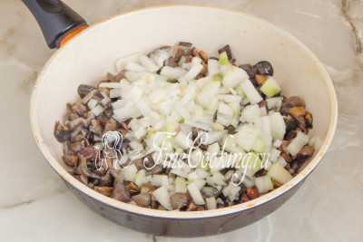 Жарим грибы с луком до зарумянивания и появления характерного аромата. Грибы нужно хорошо выжарить, чтобы не осталось влаги. Лучок тоже станет прозрачным, румяным и хрустящим.