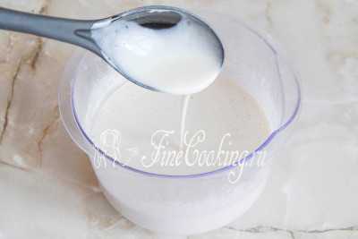 Теперь в тесто добавляем по-немногу молоко, пока оно не станет жидким, блинным. Его удобно наливать на сковороду поварешкой