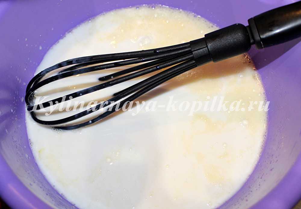 В глубокой емкости соедините куриные яйца, молоко, сахар и соль. Взбейте венчиком в пышную пену.