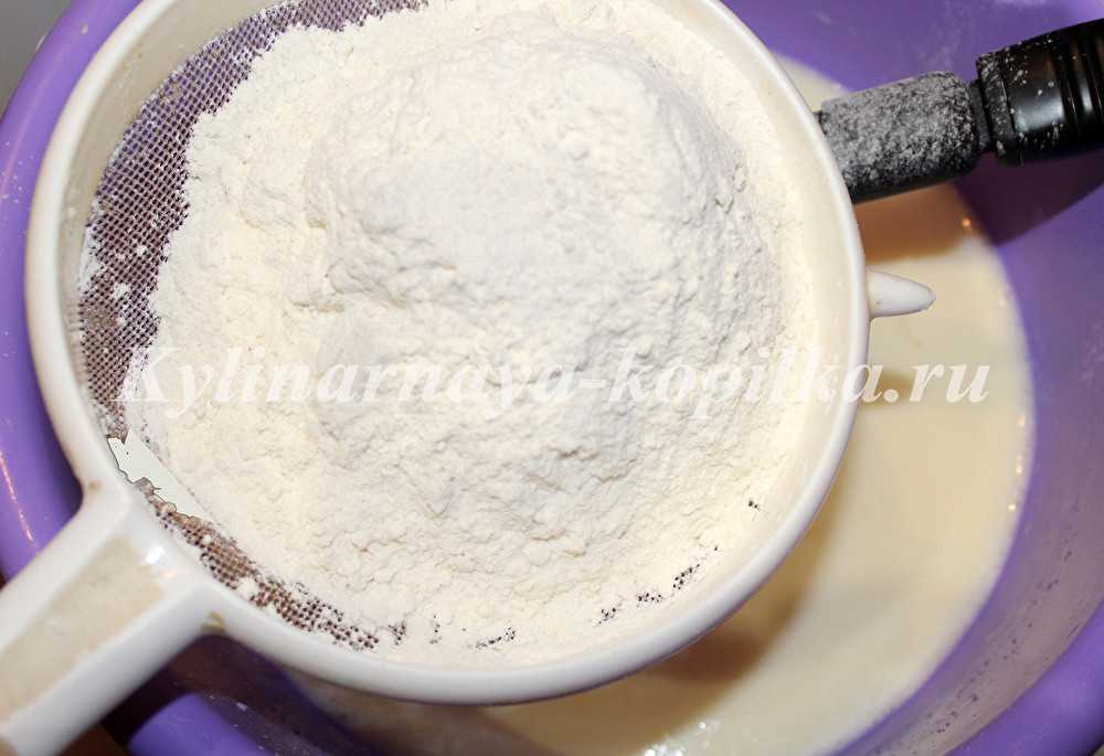 - Муку просеять, ввести в кефирную смесь, размешать, чтобы не было комочков.