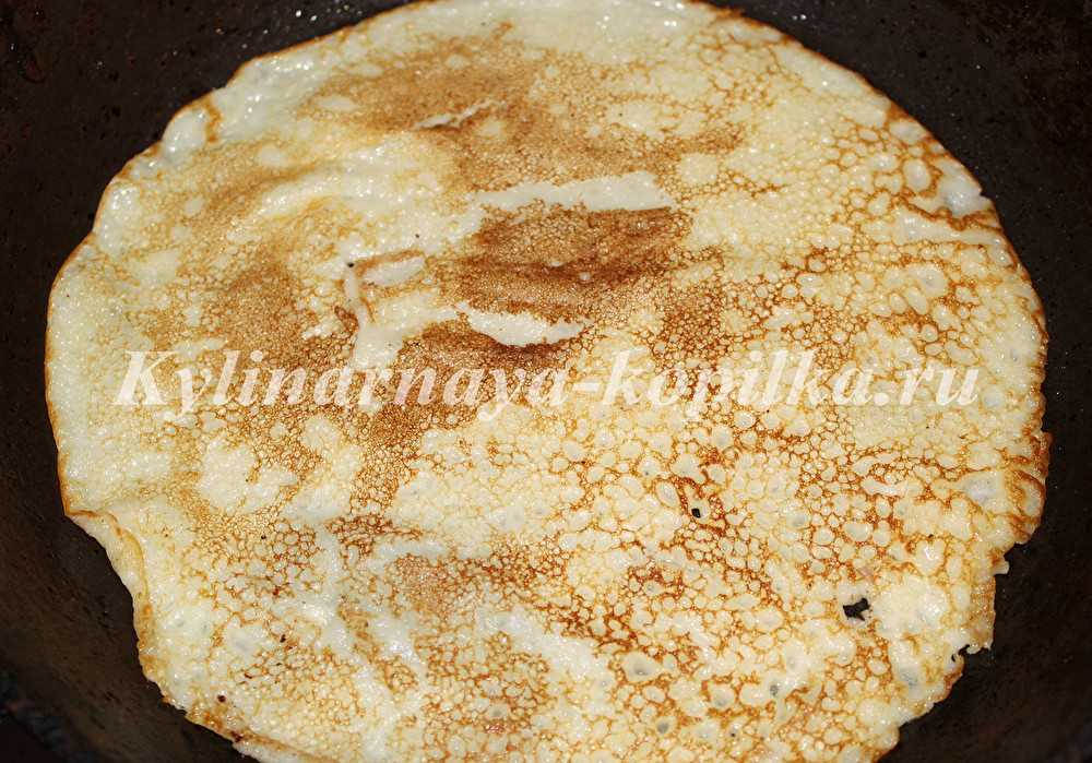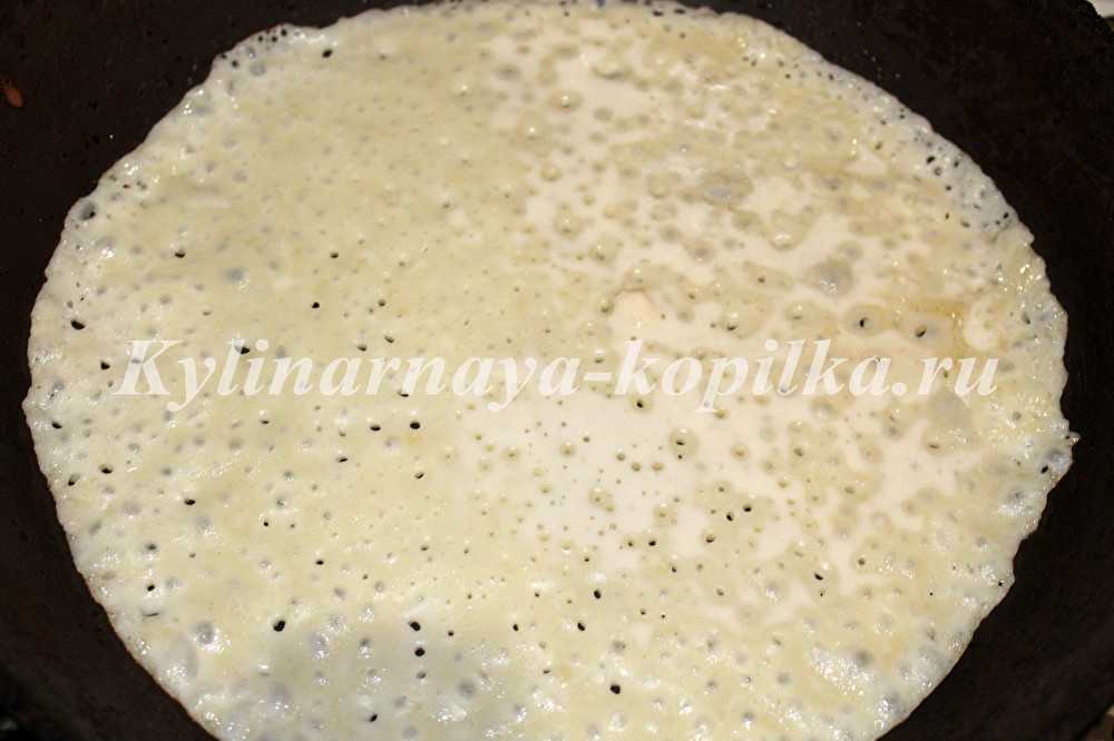 - Для первых блинов смазать маслом сковороду, прогреть. Далее сковороду смазывать не требуется.