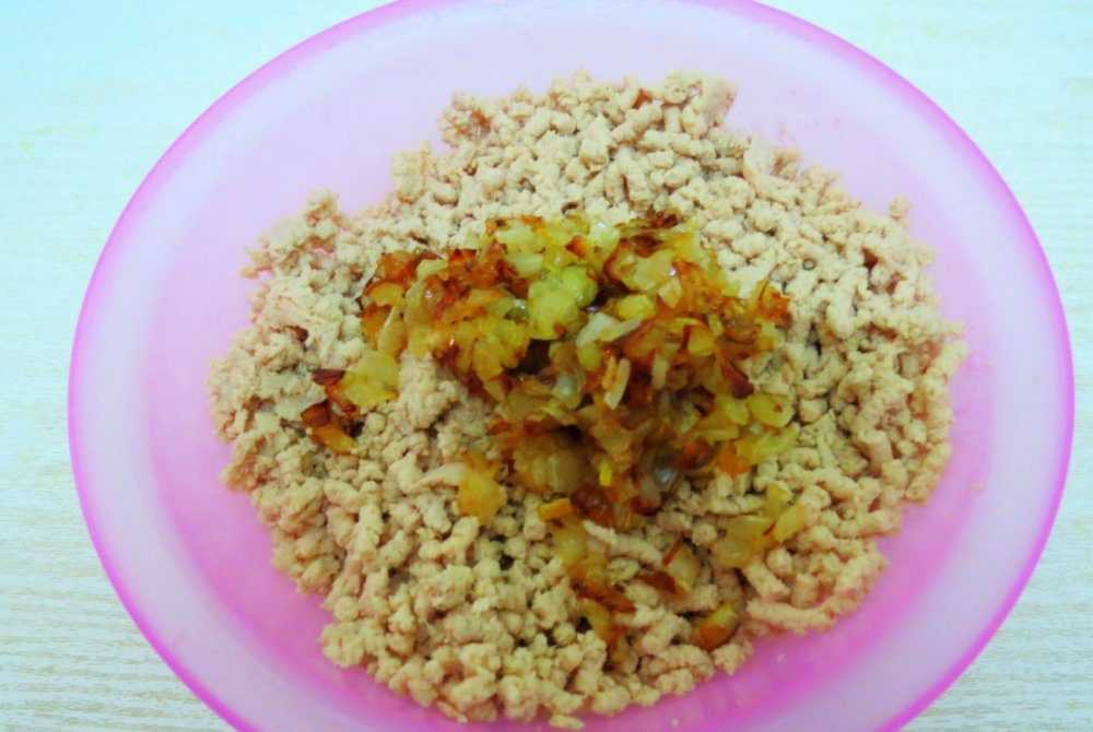 4. Свинину заранее отварите и перекрутите через мясорубку. Лук обжарьте на растительном масле и соедините с мясом.