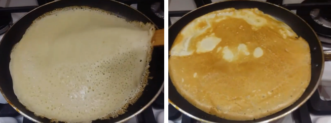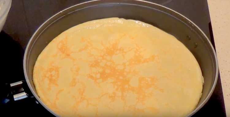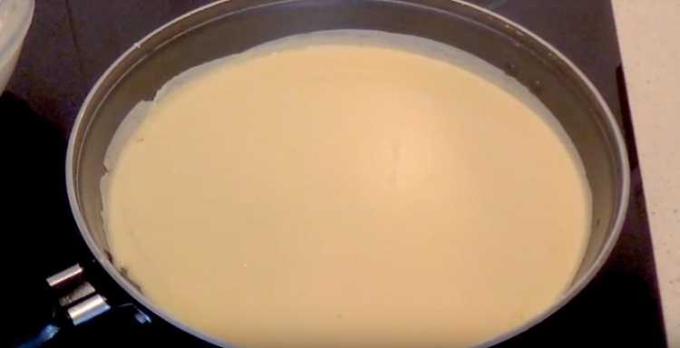 По истечении заданного времени приступаем к выпеканию. Разогретую сковороду смазываем растительным маслом, вливаем тесто, выпекаем на медленном огне с двух сторон до золотистого цвета.