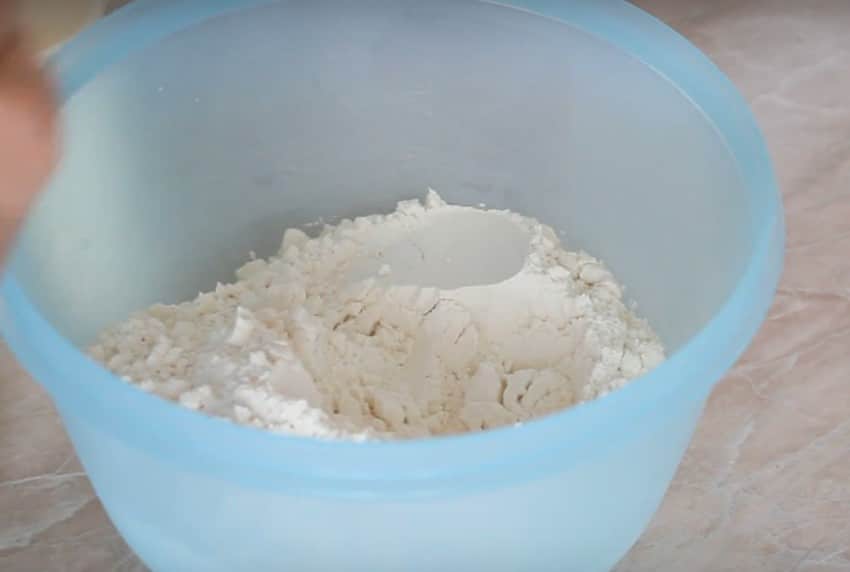 В муку всыпаем разрыхлитель, соль и сахар. Все перемешиваем в глубокой миске.