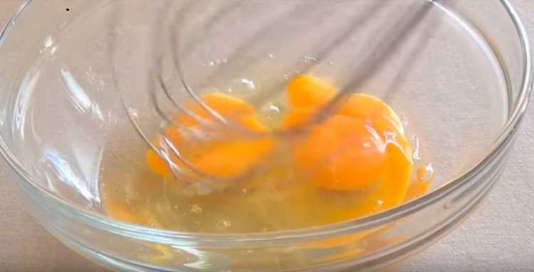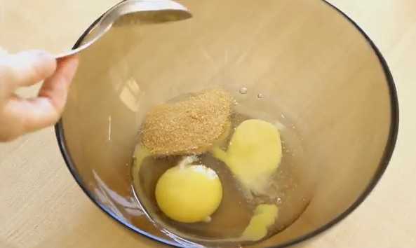 1. В чашку разбейте два яйца и перемешайте их с сахаром и солью. Взбейте венчиком до образования маленьких пузырьков.