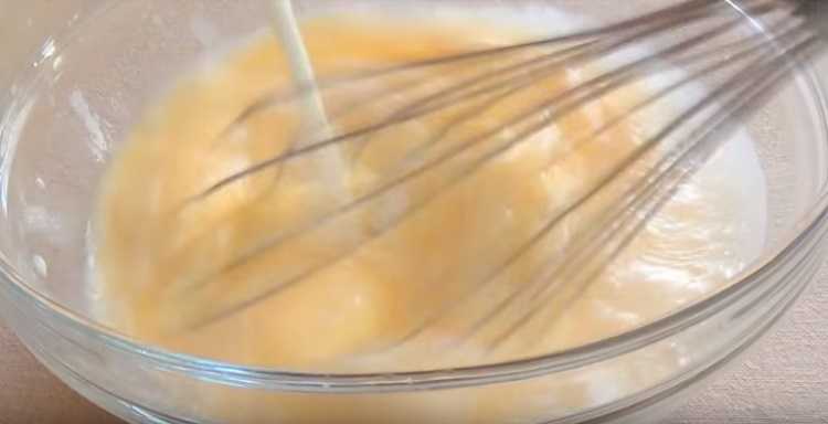 Разбиваем в емкость куриные яйца, затем, не переставая помешивать, слегка подогретое молоко.