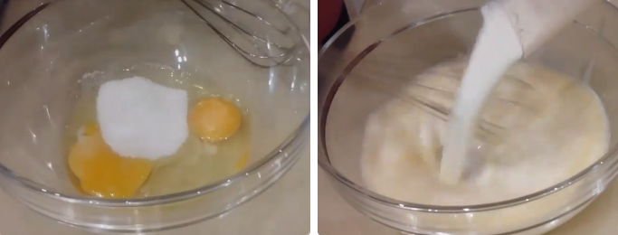 1. Вбейте в миску яйца, к ним добавьте сахар и соль. Взбейте венчиком или миксером, пока сахар растворится.