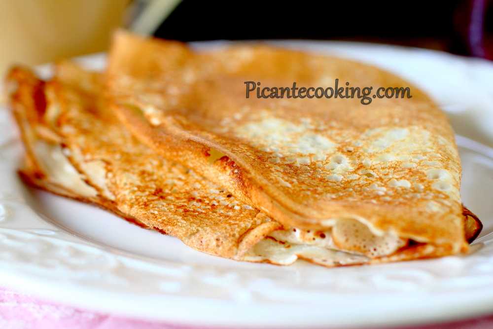 - Выпекаем блины на горячей сковороде с растопленным сливочным маслом. Подаем с жидким медом, клиновым сиропом, патокой или сгущенным молоком.