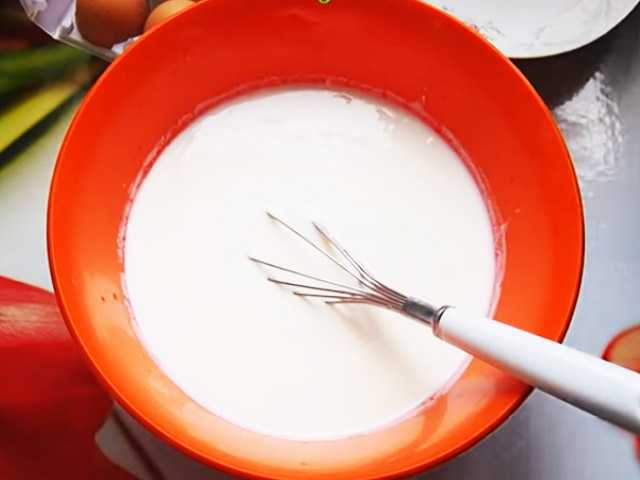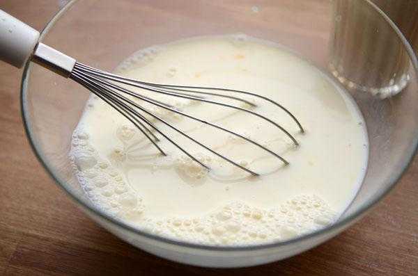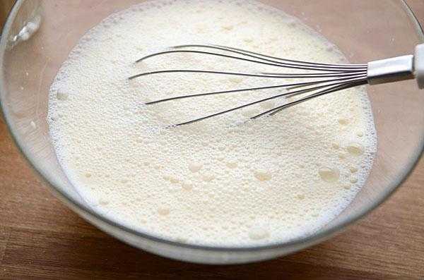 - Влейте теплое кислое молоко и венчиком взбейте смесь до гомогенного состояния.