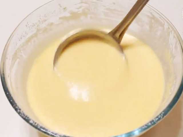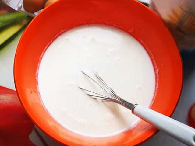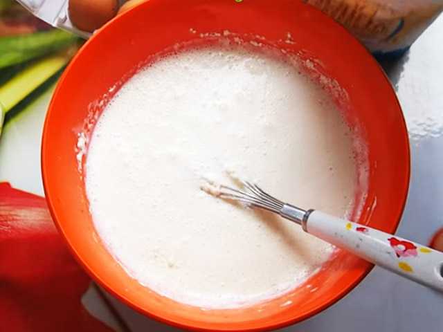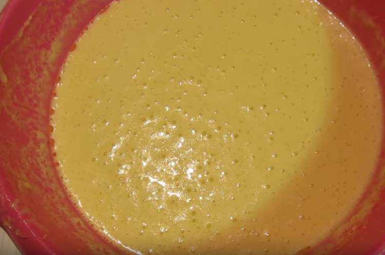 - Соединить продукты и тщательно взбить с помощью миксера или обычного венчика. Тесто должно напоминать жидкую сметану. Если же получится чуть гуще, то лучше добавить немного воды.