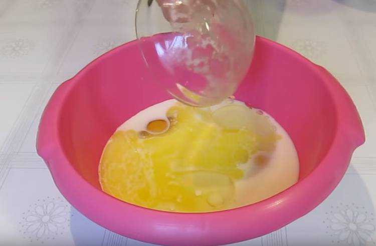 - В яичную смесь добавляем молоко, вновь все перемешиваем с помощью миксер.а Далее постепенно насыпаем муку и продолжаем взбивать. В конце добавляем сахар, немного соли, растительное масло и соду, гашенную уксусом.