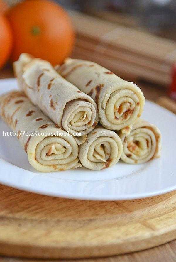 7. Готовые блинчики можно использовать под фаршировку или просто подать вот так скрученными (тут блины сначала сложили пополам, а потом плотно скрутили валиком), с вареньем или сметаной.