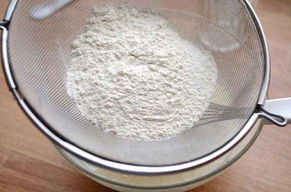 3. Муку обязательно просеять и также постепенно ввести в смесь. При этом постоянно мешая ее венчиком или миксером. Таким образом вмешать все необходимое количество. После замеса не должно остаться комочков. За этим надо внимательно следить. Эти комки сами не растворятся, и когда будете печь, они так и останутся на испеченной поверхности.
