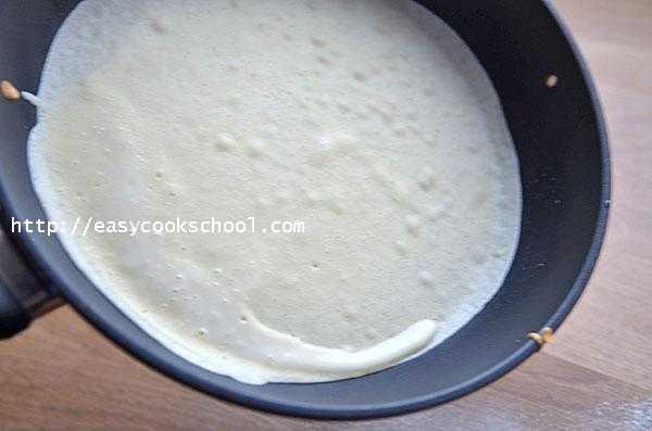 - Вылить массу на сковороду, быстро распределяя его по поверхности. Это поможет испечь тоненький лист.