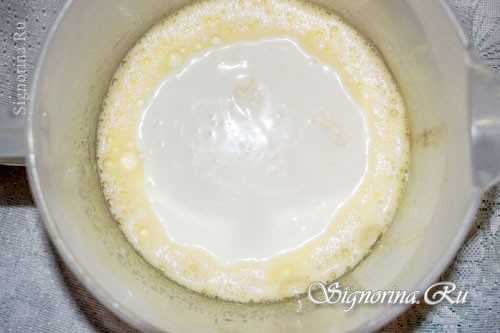 - Дальше я добавляю к яичной смеси свежее молоко, вновь перемешиваю.