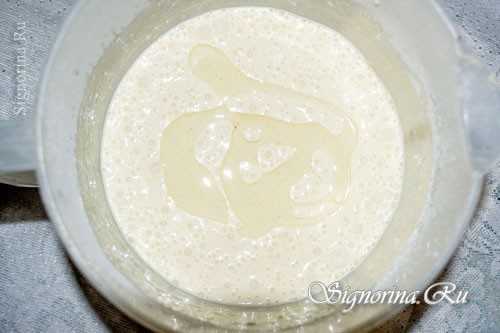 - Когда основа теста закончится, то приходит черед растительного масла. После, замешиваю наконец молочное тесто.