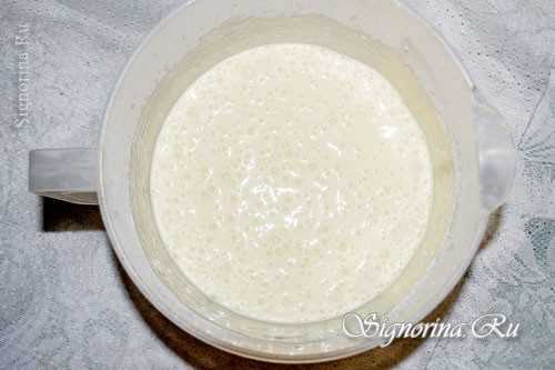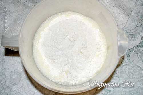- Муку просеять, ввести в ряженку и тщательно перетереть до гладкой однородной консистенции.